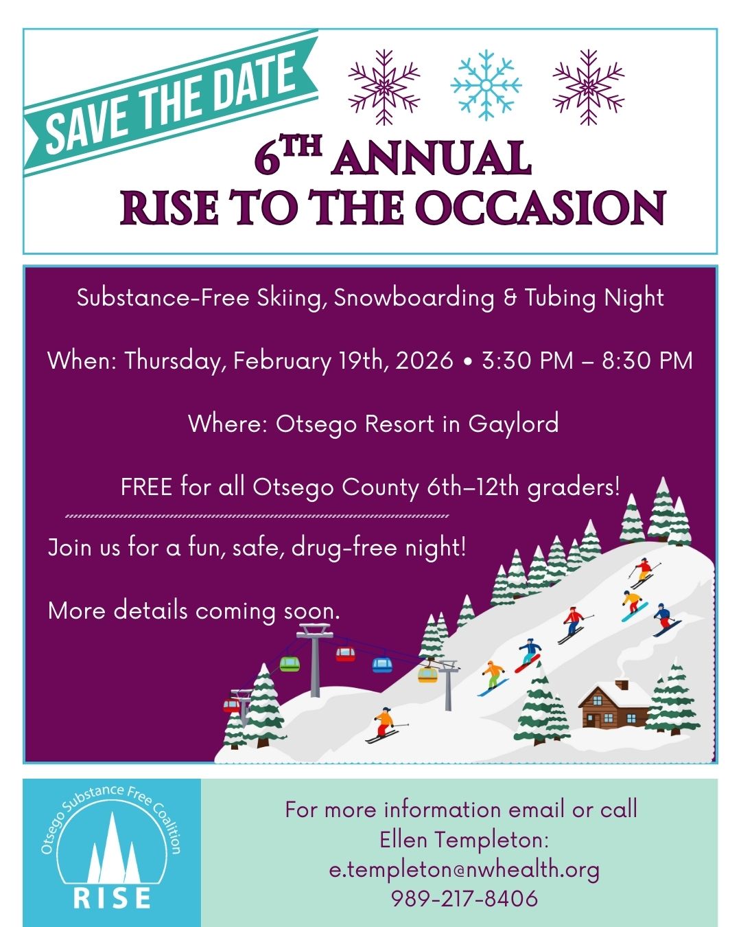 2/19/26, 6th Annual Rise to the Occasion, Otsego Resort in Gaylord, Free for Otsego county 6-12th graders.