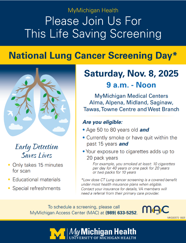 11/8/25, National Lung Cancer Screening Day, 9am-noon, MyMichigan Medical Centers-listed below.