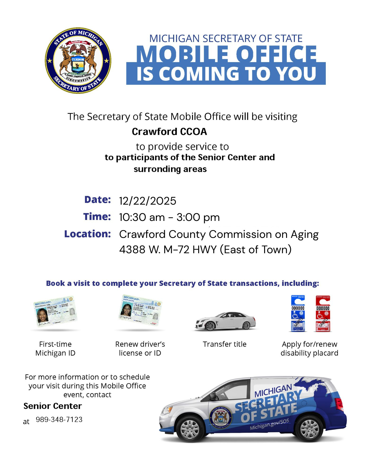 12/22/25, Mobile SOS Office, Crawford County Commission on Aging, 10:30am -3pm.