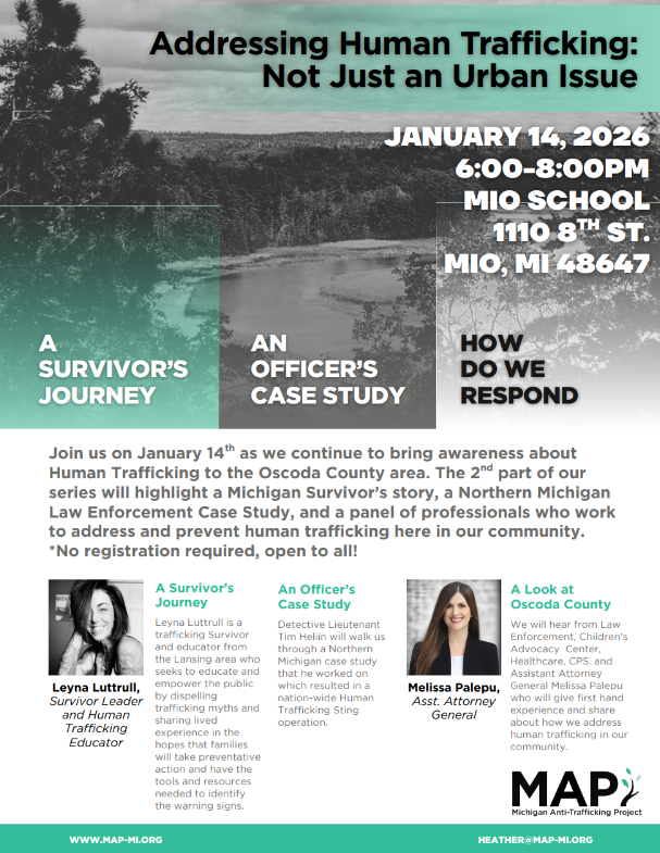 1/14/26, Addressing Human Trafficking: Not Just an Urban Issue, Mio School, 6-8pm.
