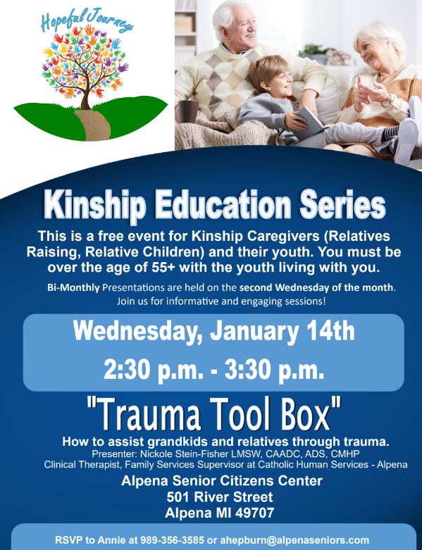 1/14/26, Kinship Education Series- Trauma Tool Box, 2:30-3:30pm, Alpena Senior Center.