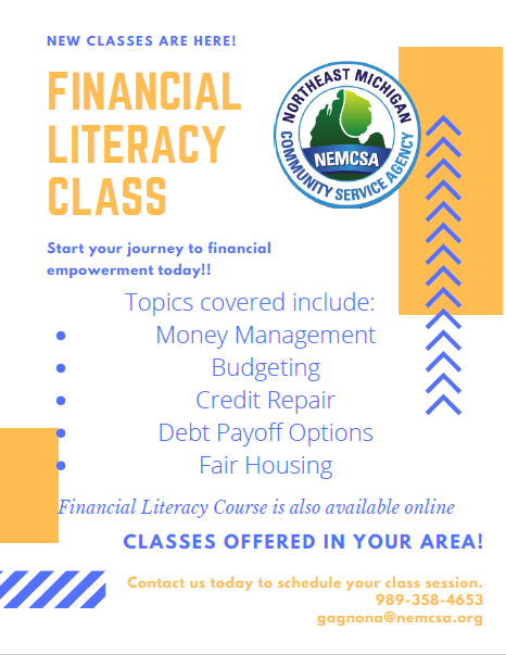 NEMCSA offers our Financial Literacy classes at various locations across our 12 county service area. If you'd like to register for a class you can contact our staff by email at housingcounseling@nemcsa.org or by phone at (989) 358-4702.